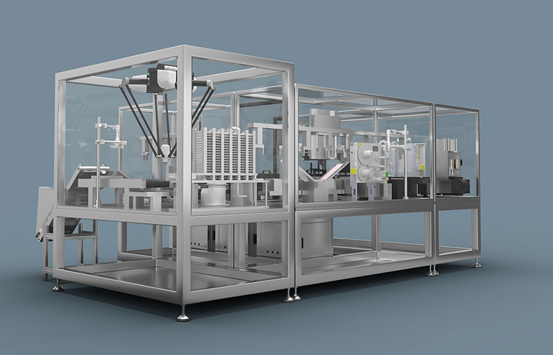试剂卡片机械手自动堆叠10片或者25片,自动上卡盒、自动一次性装10片或者25片卡片、配重块全自动组装、自动装干燥剂、自动装限位块、自动贴RFID标,自动装袋,自动封口